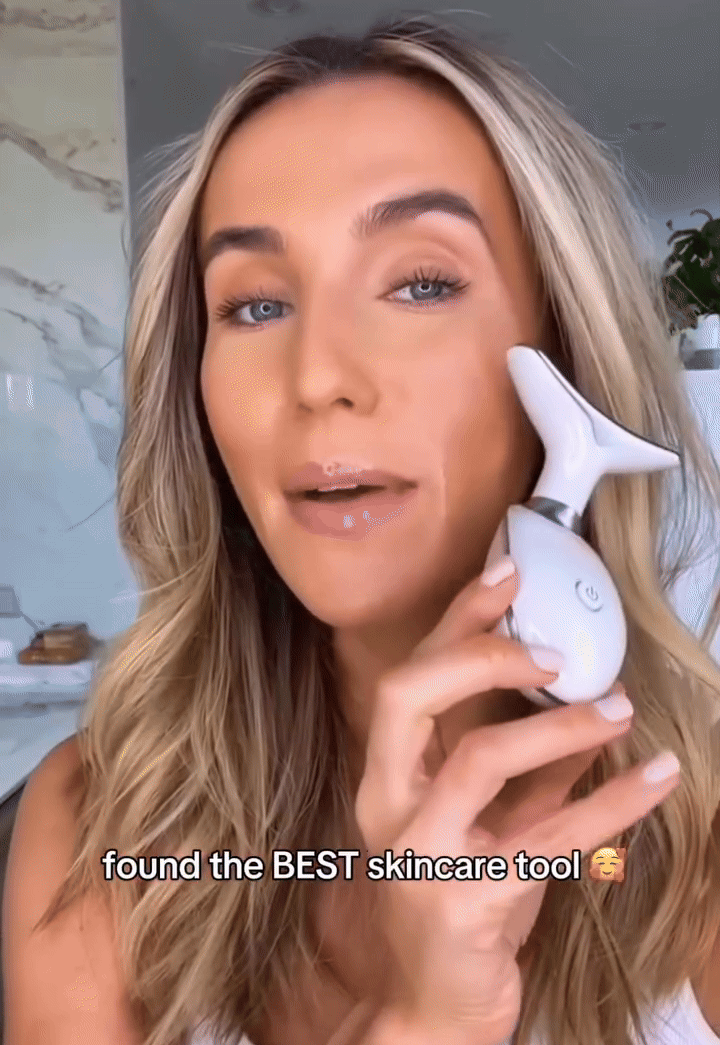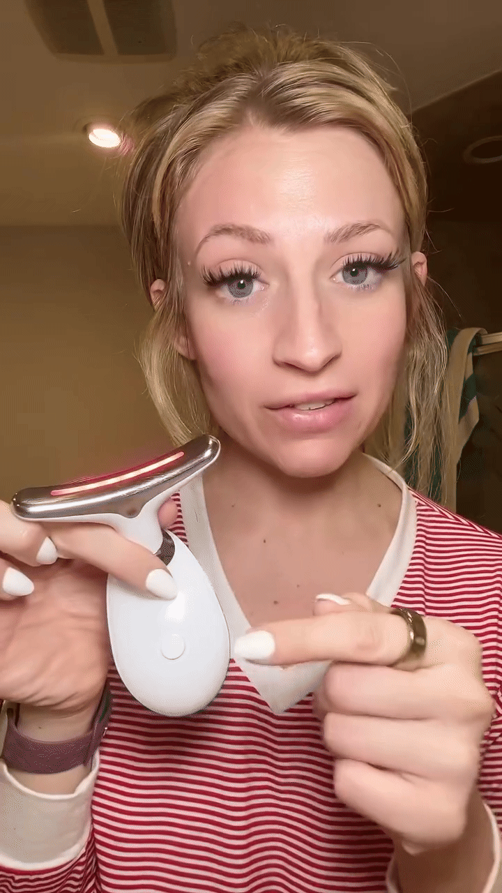 Gently move the device in slow, upward motions over your cheeks, forehead, jawline and neck. Avoid direct contact with the eyes.
